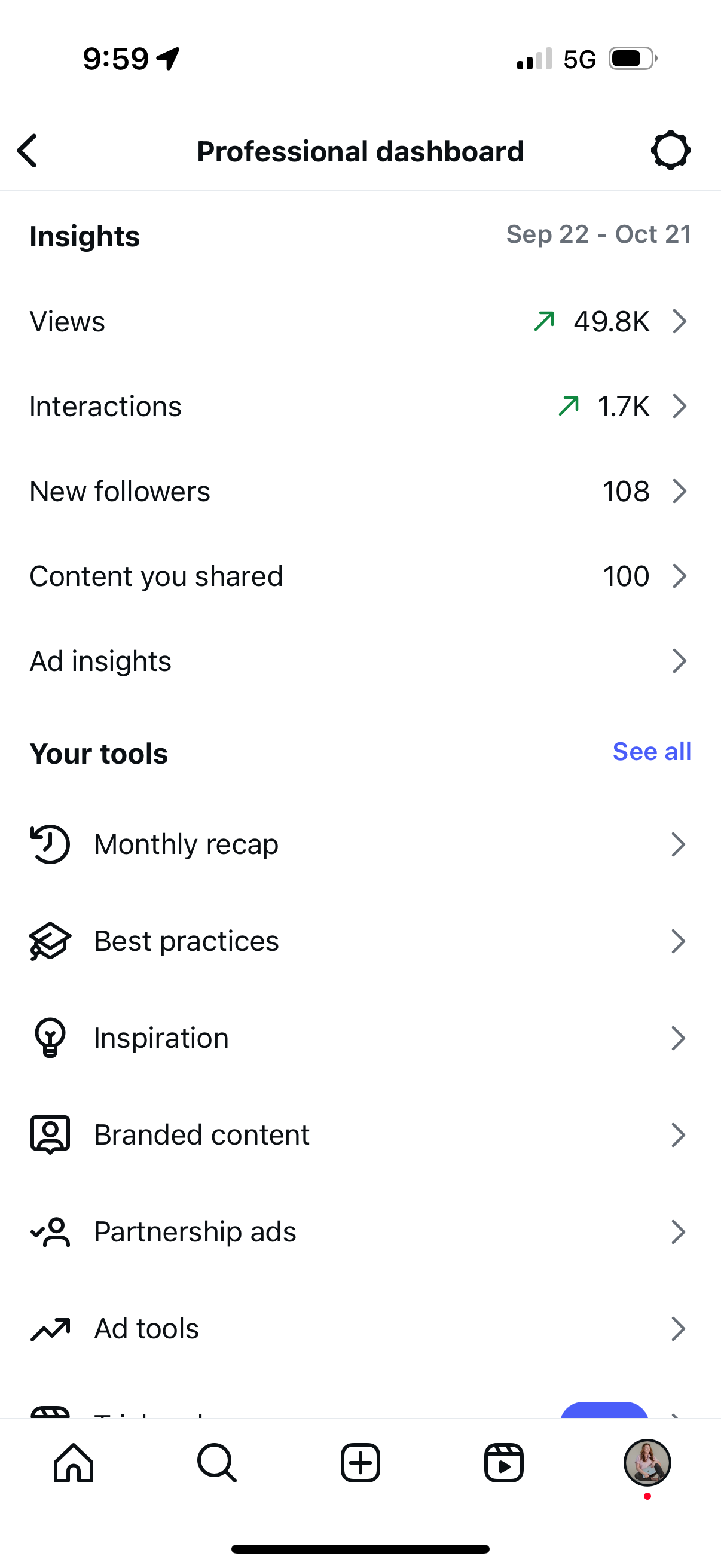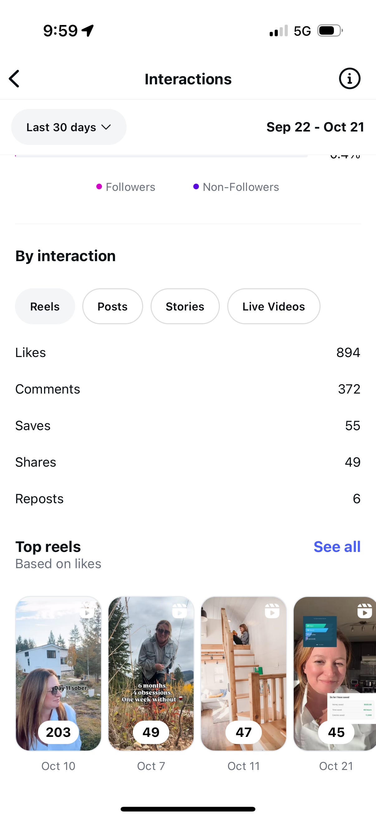 From September 22 to October 21, my account reached almost 50,000 views, had 1,700 interactions, and gained 108 new followers.